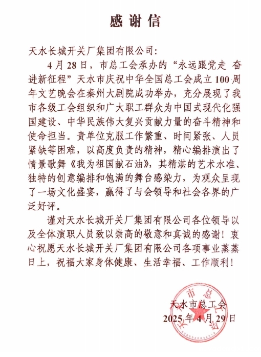 The stage shines with grace and the thanks convey warmth--Changkai Factory Group received a thank-you letter from the Municipal Federation of Trade Unions for the evening party celebrating the 100th anniversary of the founding of the All-China Federation of Trade Unions
